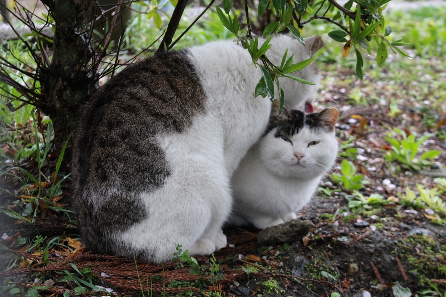 Les habitants du quartier s'occupent bien d'eux et ça se voit ! ^.^ : ils leur apportent à manger, à boire, des friandises, des jeux, des griffoirs, et bien-sûr des câlins.... J'ai adoré passer un peu de temps avec eux, et c'est bien mieux que d'aller dans un Neko Café...